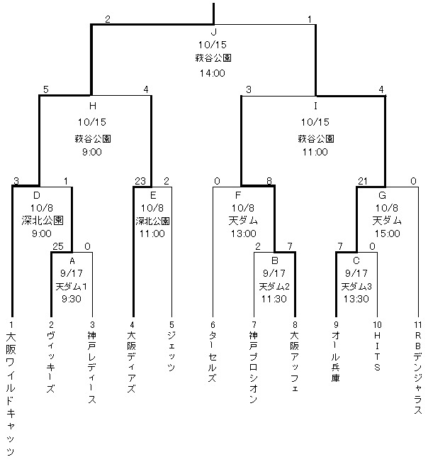 | 大阪ワイルドキャッツ | 2 | 0 | 0 | 0 | 0 | 0 | 0 | 2 |