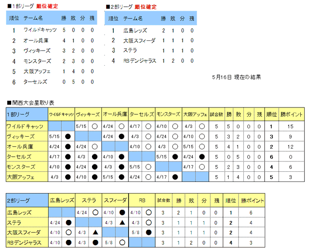 | 大阪アッフェ | 0 | 0 | 0 | 2 | 2 |