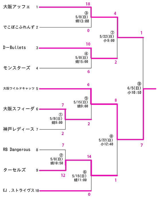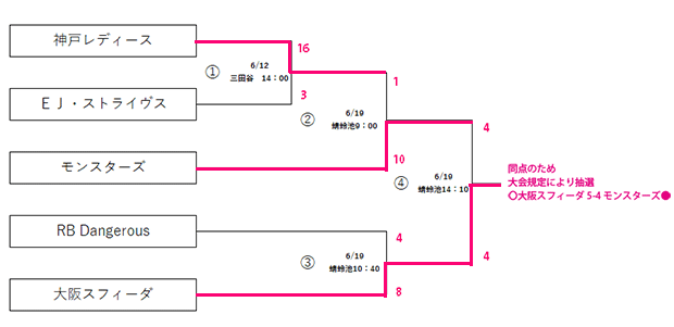 | 大阪ワイルドキャッツ | 0 | 2 | 0 | 0 | 4 | 0 | x | 6 |
