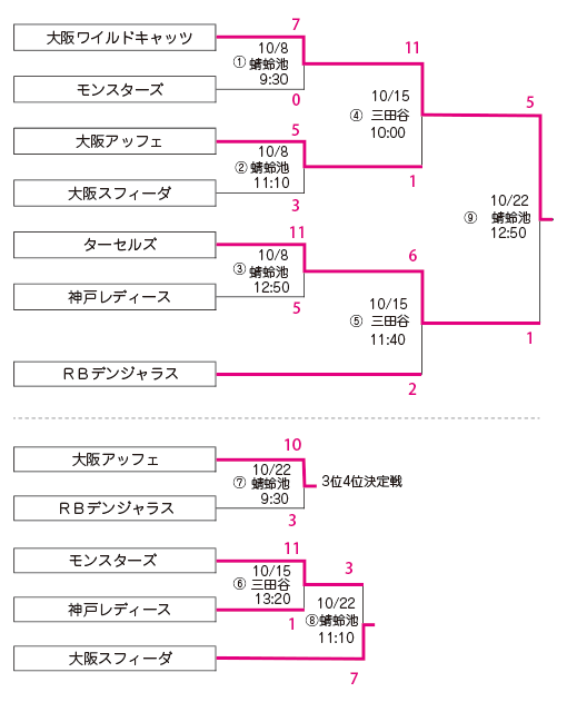 10/22 蜻蛉池公園 決勝戦| 大阪ワイルドキャッツ | 0 | 0 | 2 | 0 | 2 | 1 | 0 | 5 |